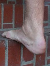 Die Übungen können selbstständig ohne Hilfsmittel außer einer Stufe durchgeführt werden. Man stellt sich am besten barfuß auf die Zehenspitzen, hält diese Position für 2 Sekunden und senkt dann den Fuß wiederum für 2 Sekunden unter die Horizontale, daher ist auch die Treppenstufe notwendig. Start ist beidbeinig, nach 2- 3 Wochen sollten Sie diese Übung einbeinig absolvieren, um die Last noch zu erhöhen (ggf. mit einem Rucksack mit Gewichten beschwert).