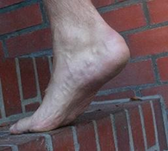 Die Übungen können selbstständig ohne Hilfsmittel außer einer Stufe durchgeführt werden. Man stellt sich am besten barfuß auf die Zehenspitzen, hält diese Position für 2 Sekunden und senkt dann den Fuß wiederum für 2 Sekunden unter die Horizontale, daher ist auch die Treppenstufe notwendig. Start ist beidbeinig, nach 2- 3 Wochen sollten Sie diese Übung einbeinig absolvieren, um die Last noch zu erhöhen (ggf. mit einem Rucksack mit Gewichten beschwert).